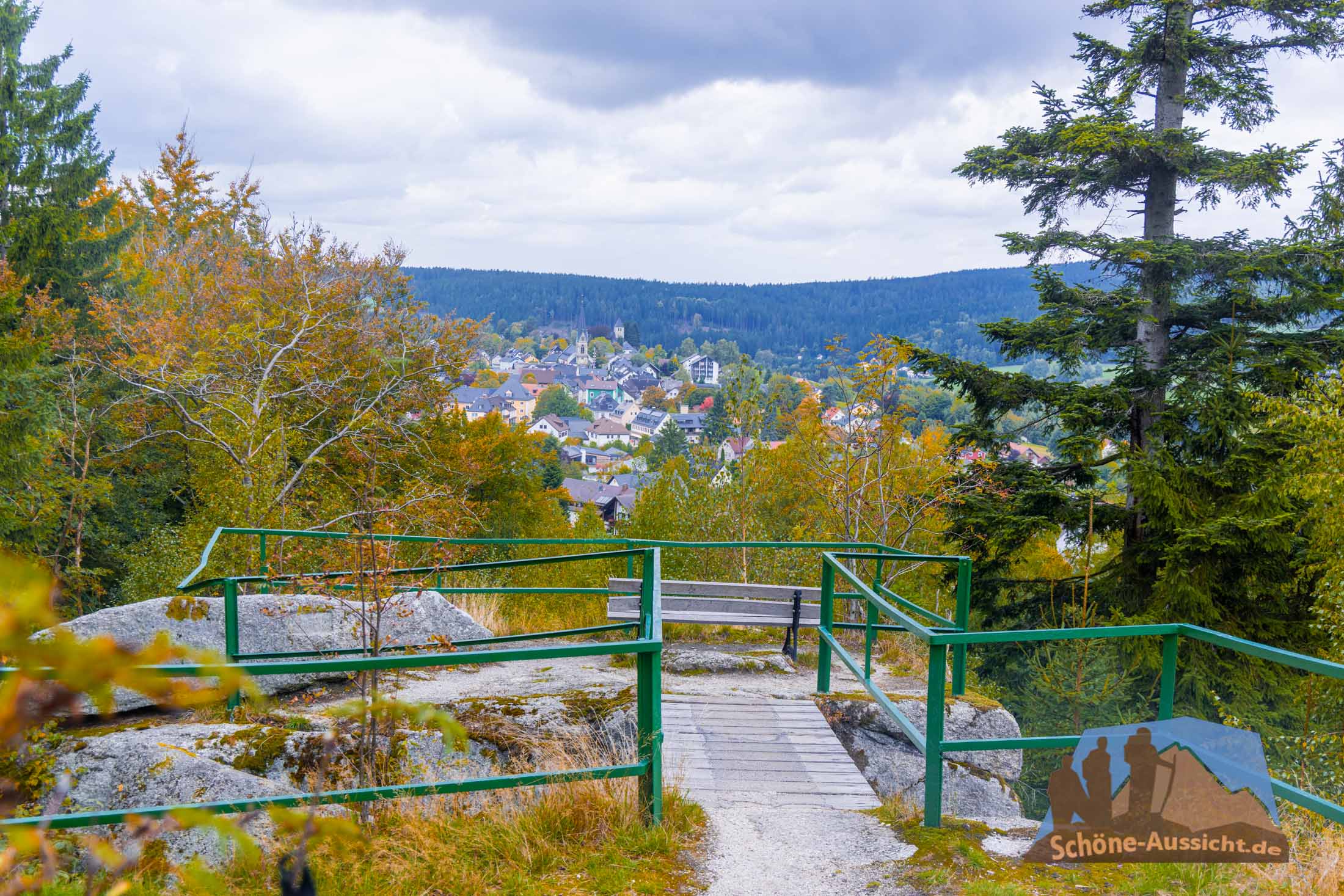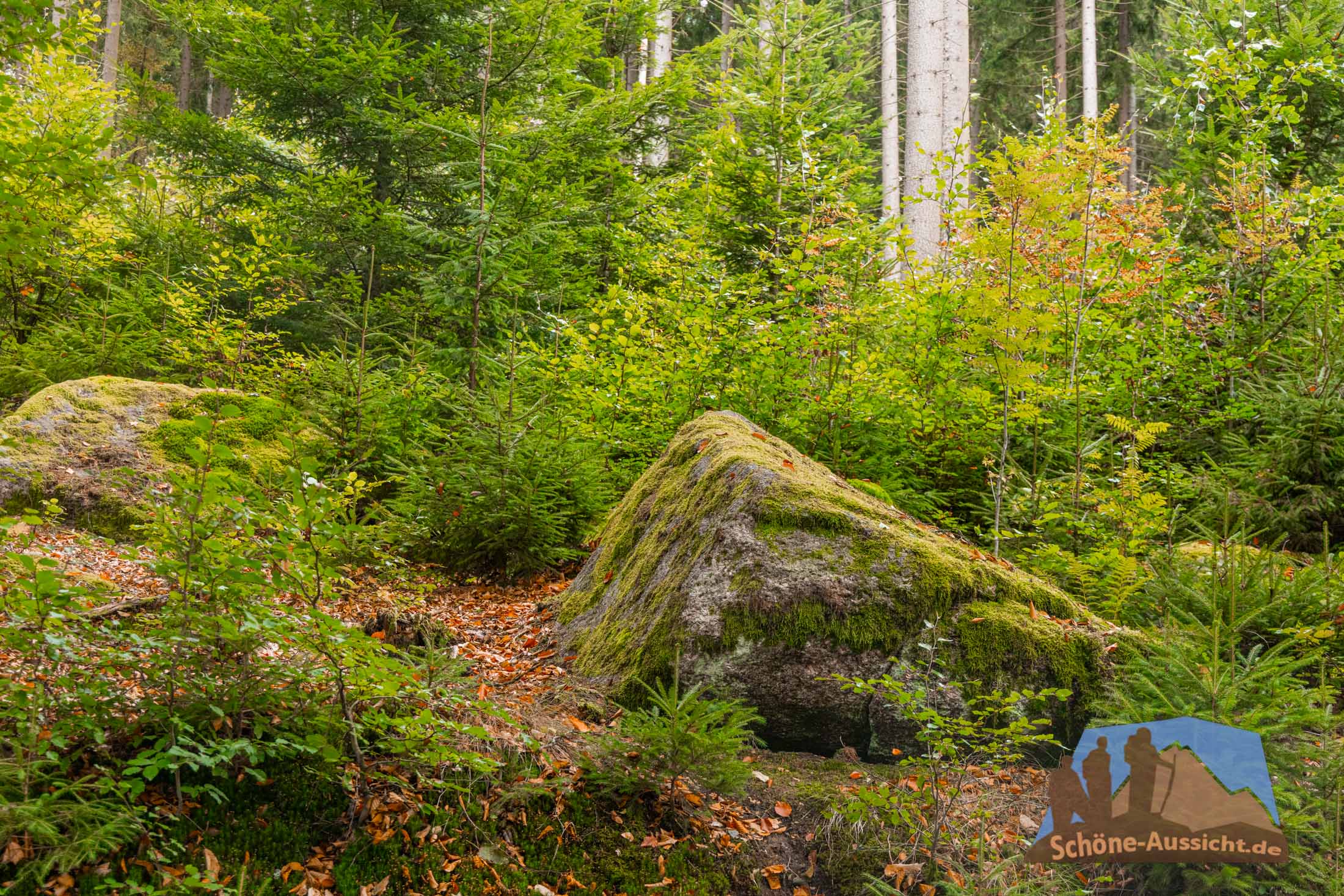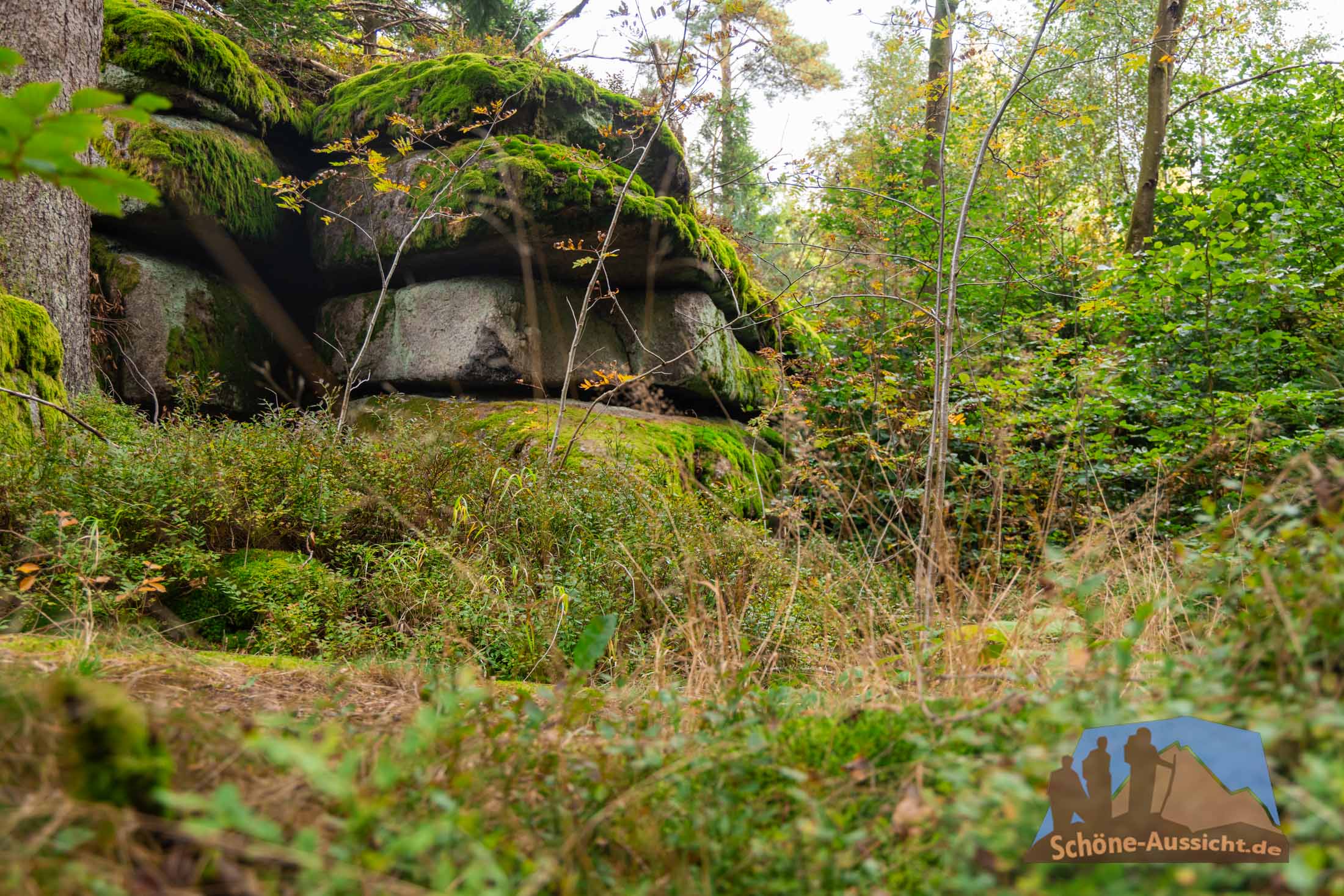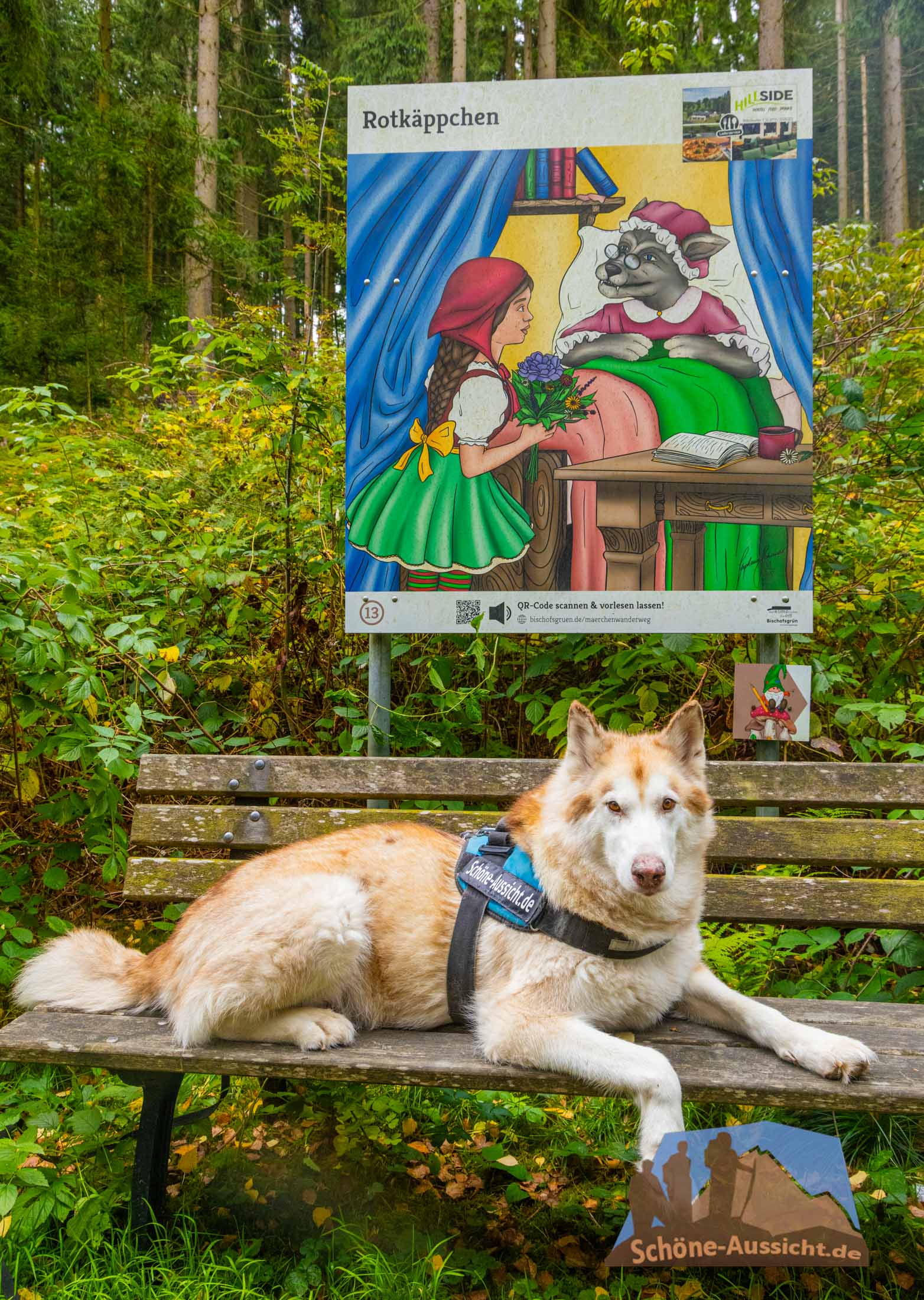 Ihr geht aus Bischofsgrün hinaus und hat gleich den Tapetenwechsel. Zuerst die Infotafel und dann kamen die Märchentafeln. Aber nicht ohne eine schöne Aussicht! Man folgt dem Weg linker Hand und kommt auf ein kleines Steinplateau mit einer herrlichen Aussicht über Bischofsgrün und auf das Fichtelgebirge. Der Weg ist leicht, gut ausgebaut und perfekt für Familien.