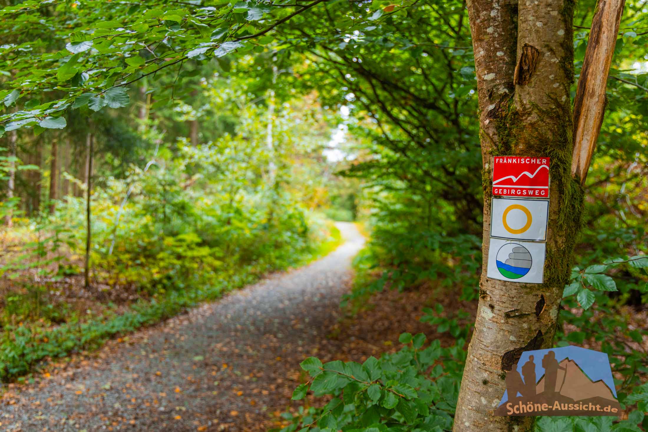 Oft gibt es dabei auch Sitzbänke oder Infotafeln von weiteren Wanderwegen. So wandert ihr auch gleich ein Stück auf dem Fränkischen Gebirgsweg.